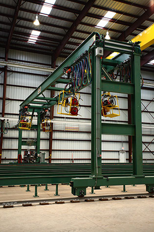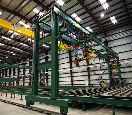 The Service Gantry spans the panel line and travels on floor and/or wall mounted rails. It serves as a moving work station that supports components used to manually finish weld pre-located webs, stringers, frames, brackets or miscellaneous parts on a