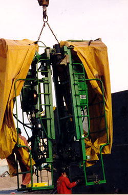 The machine travels along the top of the tank's vertical plates and welds them to ones immediately beneath. Safety support arms are welded on each truck to prevent the machine from falling should a wheel run off the plate edge. The machine has a lifting eye and cable disconnects to simplify moving. A cable support arm holds the cables clear of the scaffolding generally placed around the tank.